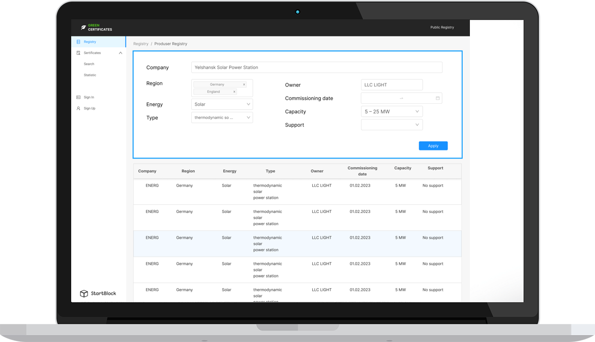 The platform allows issuing green certificates for every 1 MW of proven green energy generated. Automatic validators validate energy production based on climate data. The owner of the certificates can transfer certificates and place them on the trading floor. The ultimate certificate holder can redeem certificates and guarantee green energy support for any audience by providing information from the blockchain registry. Large, medium, and small companies can support the generation of green energy and demonstrate it to their customers, and responsible people can directly support green energy by purchasing and redeeming Green Certificates.